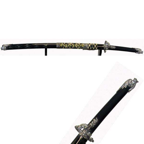 Detta 43" samurajsvärd är tillverkat av rostfritt stål och har en unik drak-tsuba. Medföljande är två kastknivar som är fästa till den svarta svärd slidan. Ett perfekt val för samlare eller som en dekorativ detalj.