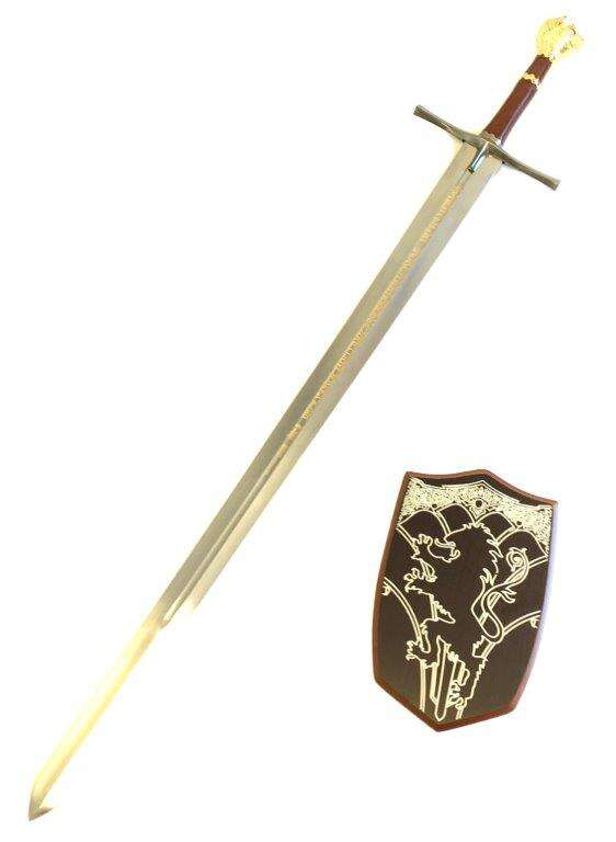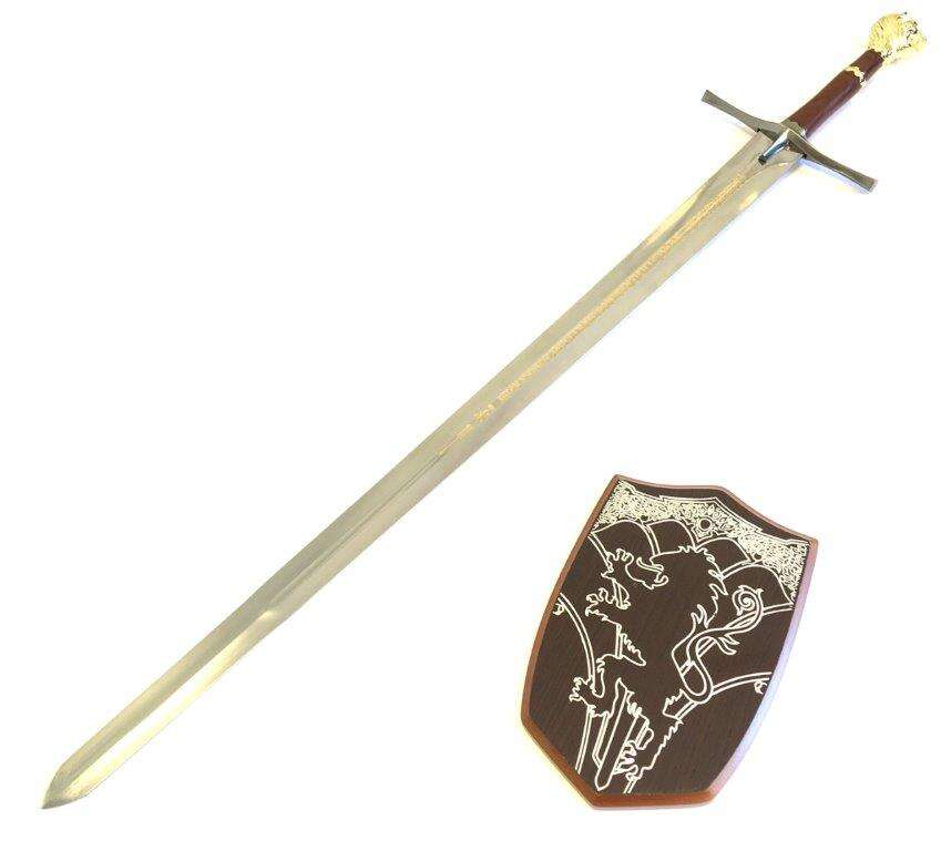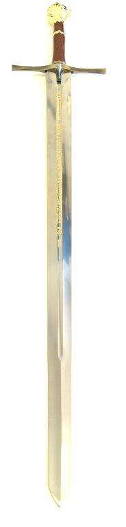 Med en total längd på 1145mm erbjuder detta replikasvärd en ståtlig profil. Bladlängden på 923mm och en bladtycklek på 5.0mm ger det en autentisk känsla. Svärdet levereras komplett med en medföljande träplakett för enkel och säker display.