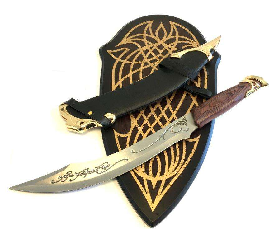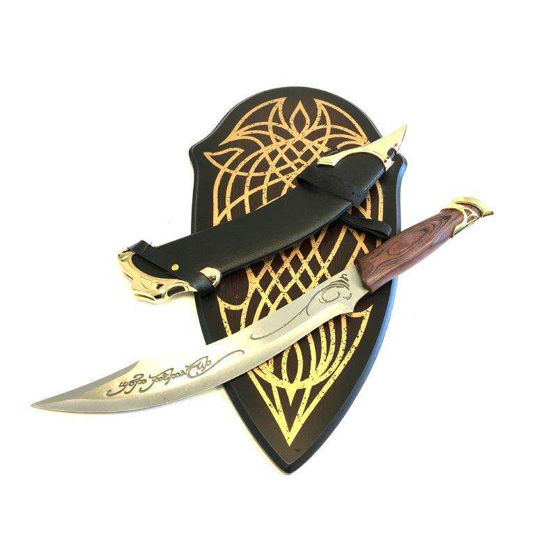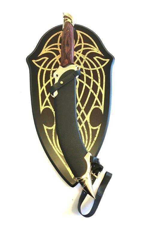 - Slida: Läderslida (Leather Scabbard) som inkluderar en matchande Träplakett (Wooden Plaque) för säker förvaring och elegant uppvisning.