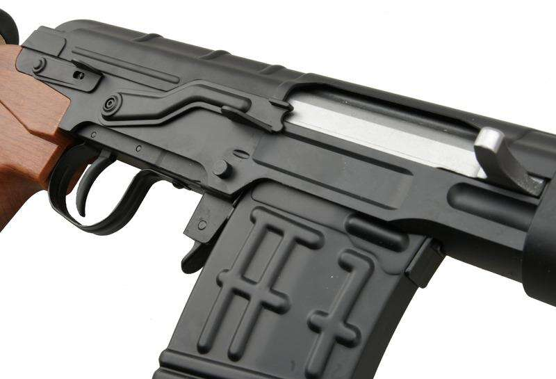 Denna fjäder-drivna ryska sniperreplika från GFC Guns kombinerar metall och högkvalitativt trälaminat för att efterlikna den klassiska ryska SVD Dragunov. Metallkonstruktionen omfattar kropp, pipmontering och järnsikten. Kolv och främre grepp är tillverkade av slitstark plast med en grov textur för säkert grepp även i fuktiga förhållanden.