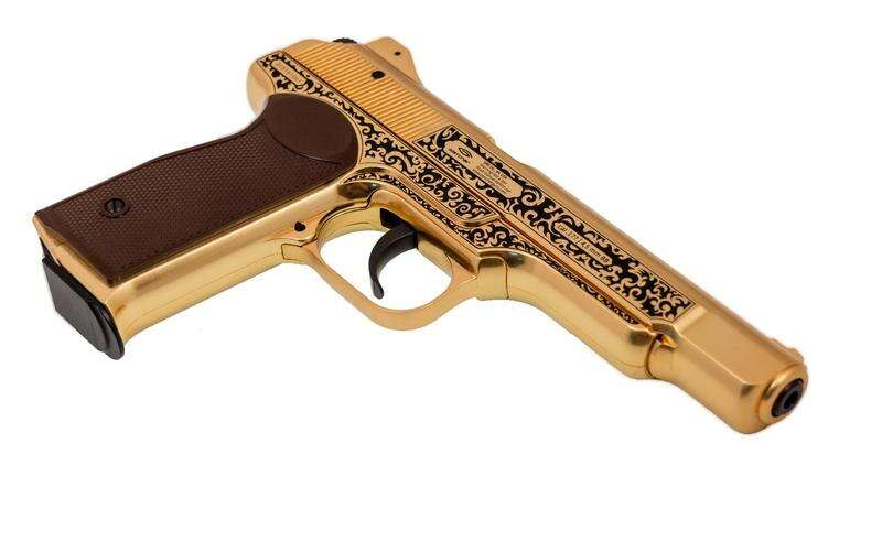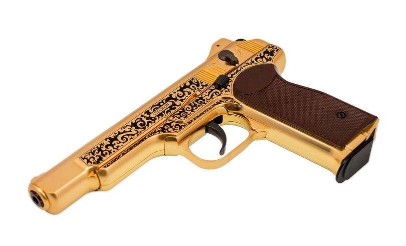 Gletcher GLSG51B Limited Edition luftpistol i en unik guldfärgad finish. En luftpistol skapad för samlare, maffioso, gangsters, diktatorer... eller vilken individ som helst vars sidovapen måste vara lika djärvt som deras personlighet. Lystern i finishen och det dekorativa svart- och guldmönstret gör verkligen att denna pistol sticker ut. Gletcher GLSG51B är medlem i Gletchers serie "Russian Legends" av pneumatiska vapen. Med ett Blowback-system och en vikt och storlek som är identisk med originalet, har denna luftpistol en hög nivå av autenticitet och realism. Ett måste för den som söker en unik luftpistol.