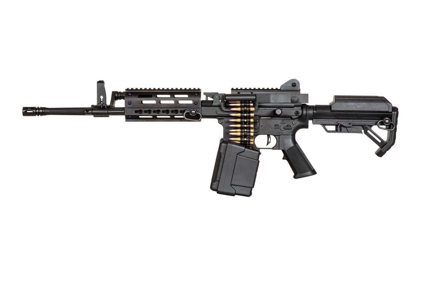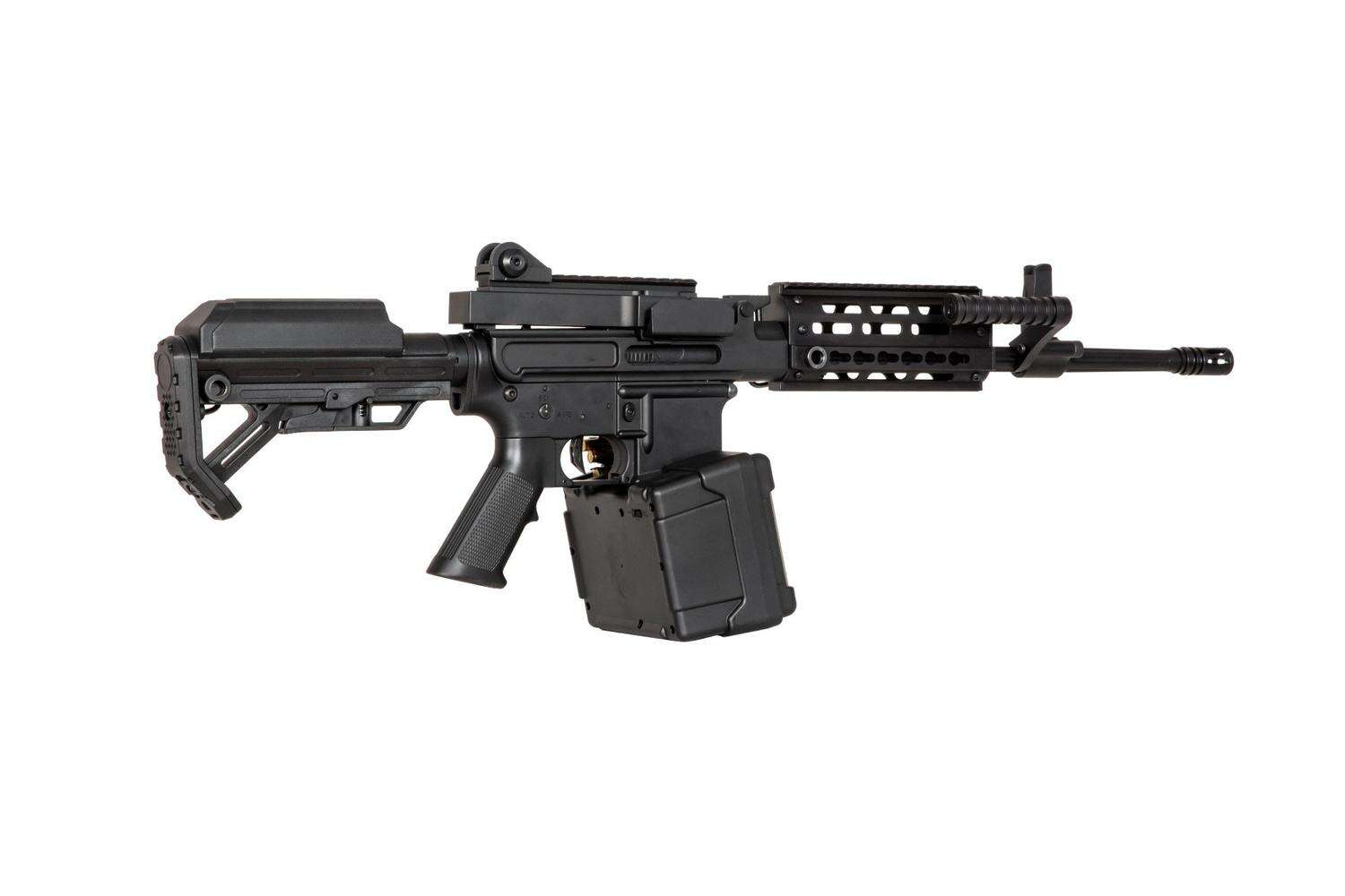 Denna replika av en kulspruta är till största delen tillverkad av högkvalitativ metall och i mindre utsträckning av en polymer. Den övre och nedre mottagaren, pipan med snabbkopplingssystem och RIS / Keymod-skenan är tillverkade av metall. Replikan har flera fästpunkter för QD-slingor. För tillverkning av pistolgrepp och justerbar kolv har tillverkaren använt slitstark polymer. Kolven har ett fack för ett batteri och ett elektriskt magasin med en kapacitet på upp till 2500 BBs.