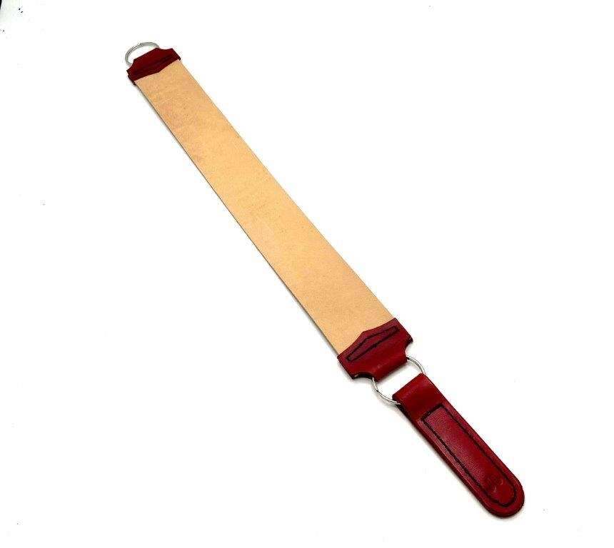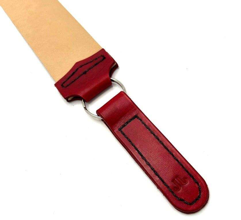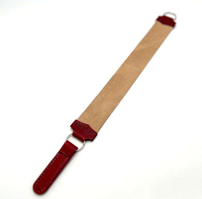 De runda öglorna möjliggör enkel fastsättning på olika ställen, som dörrhandtag eller krokar, och säkerställer att strigeln alltid hänger rätt. Handtaget är separat från remmen, vilket gör att lädret förblir i samma position även om du rör på handen. Dessa detaljer gör vår produkt överlägsen många andra alternativ. Den har en generös yta för polering och slipning, ca 36 x 5 cm, och en total längd på ca 60 cm.