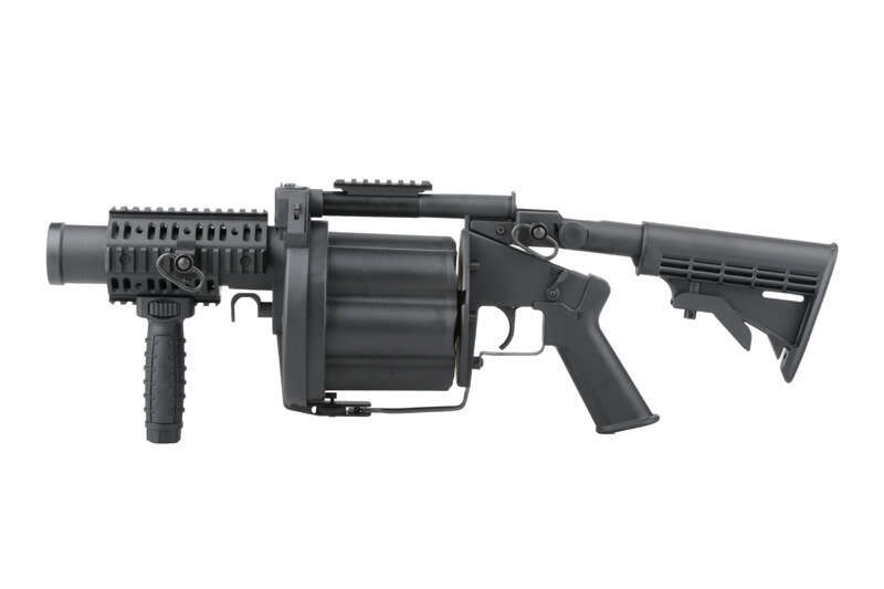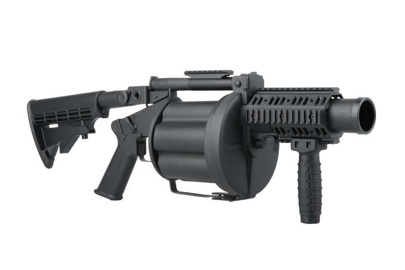 ICS-190 MGL Revolver granatkastarreplika - En kompromisslös replika som tillåter att avfyra 6 granater inom några sekunder och som ett resultat skjuta iväg över 1000 BBs på slagfältet på ett ögonblick. Granatkastaren drivs av alla standard, airsoft, 40mm granater (130mm långa).