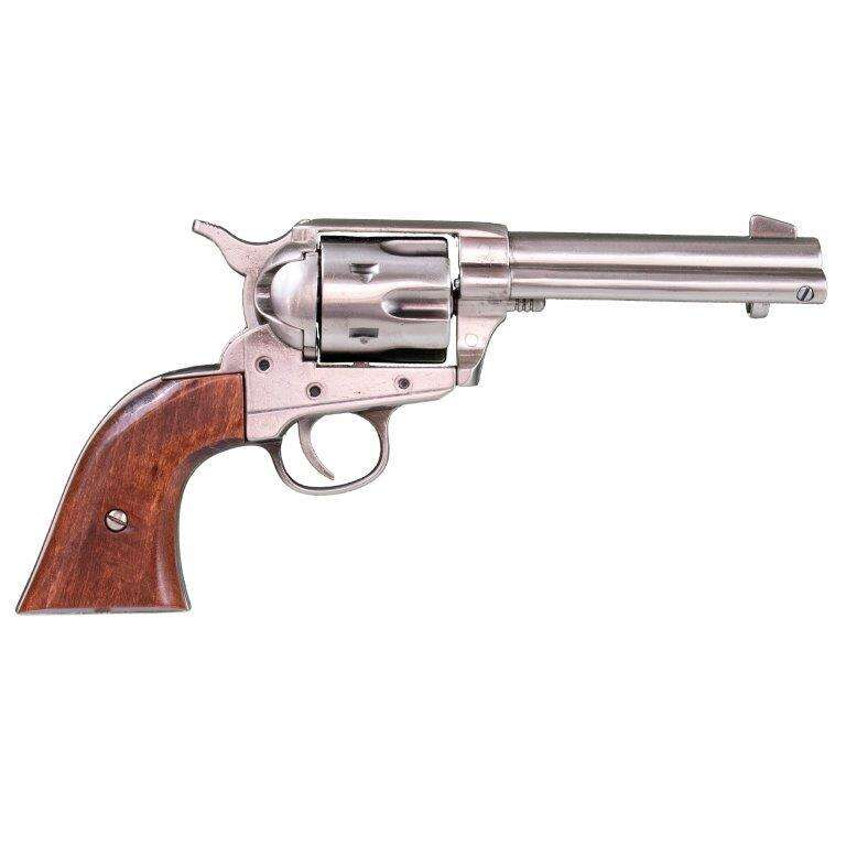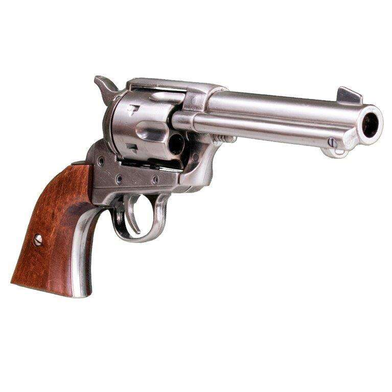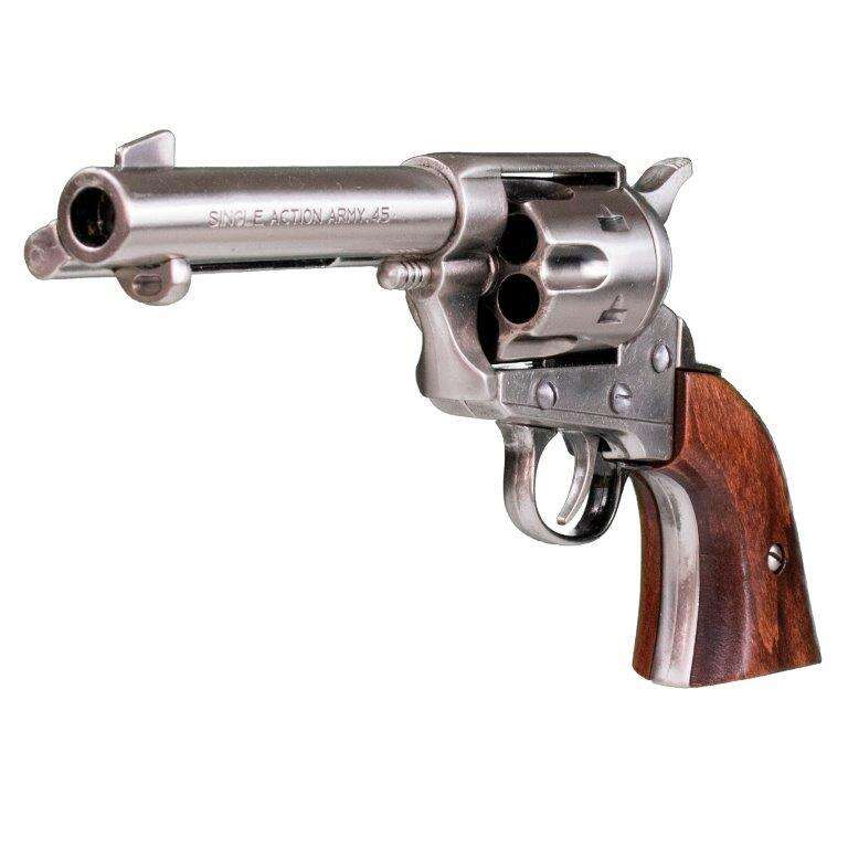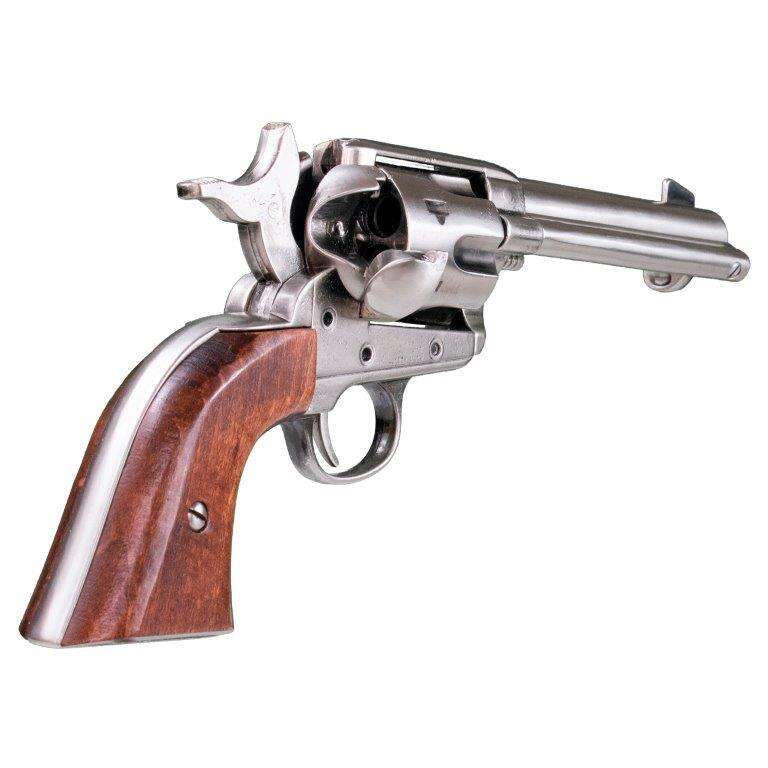 Colt 45 Peacemaker 4’75” USA 1873 replika revolver modellen finns i mässing-, blåelse-, nickelpläterad- och åldrad metall-finish, uppnådd genom manuella processer som appliceras på varje del av pistolen, med ett grepp gjort av äkta trä eller ett högkvalitativt handtag i antingen elfenbensimitation, imiterat ben eller imiterat trä, vilket återskapar en av Gamla Västerns mest ikoniska revolvrar.