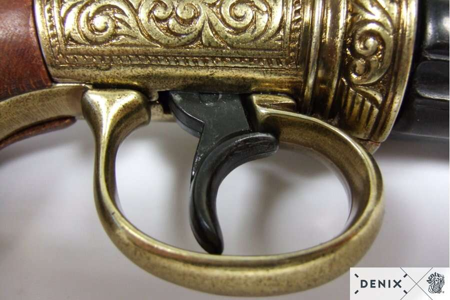 Denna detaljrika replika av en pepperbox revolver återskapar en klassisk 1800-tals design. Tillverkad av metall och träimitation, har denna revolver sex pipor som roterar. Mekanismen möjliggör avfyrning, vilket gör den till ett intressant samlarobjekt.