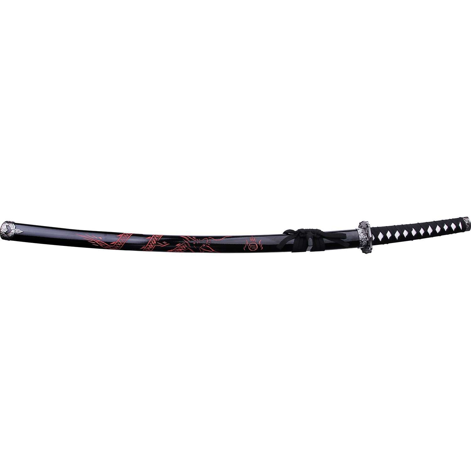 Detta samurajsvärd är noggrant utformat med en 24.5-tums satinblad tillverkad av rostfritt stål, vilket ger en skarp och elegant look. Det svarta sladdlindade handtaget ger ett bekvämt och säkert grepp, vilket gör det enkelt att hantera och visa upp. Den medföljande svarta slidan har en röd snidad drake, vilket lägger till en touch av traditionell japansk konstnärlighet.