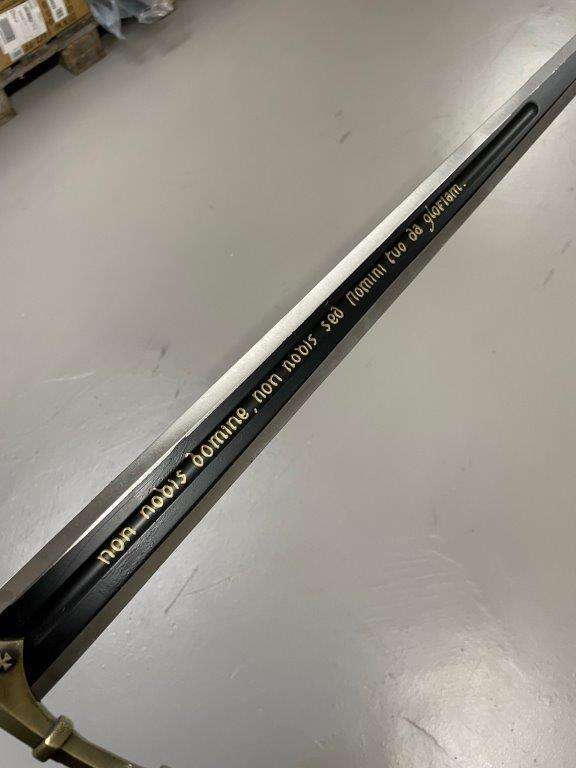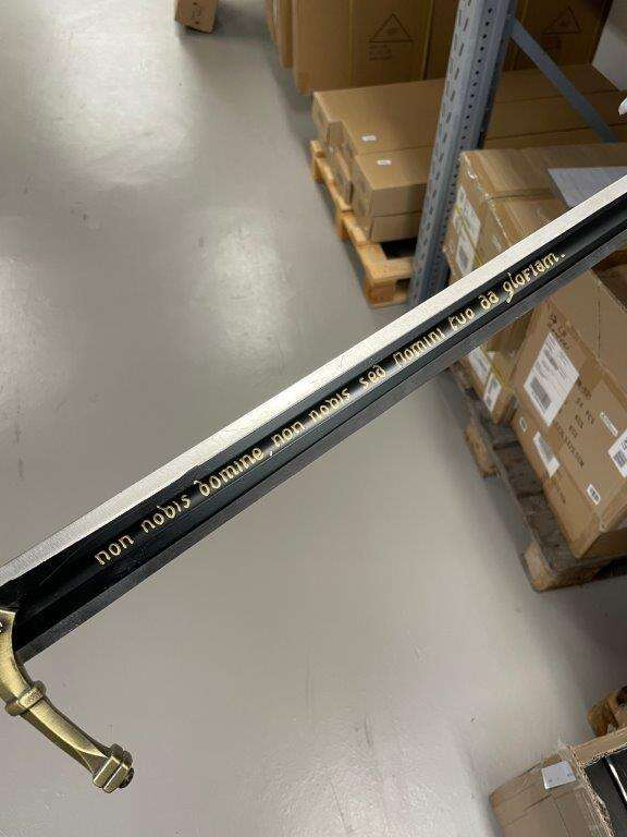 En av svärdets mest distinkta egenskaper är den latinska tempelriddarfrasen som är ingraverad på bladet eller handtaget: "Nōn nōbīs, Domine, nōn nōbīs, sed nōminī tuō dā glōriam". Denna fras, som betyder "Inte åt oss, Herre, inte åt oss, utan ditt namn give ära", understryker svärdets autentiska koppling till Tempelriddarorden och dess värderingar. Upptäck mer om våra historiska replikor på vår hemsida.