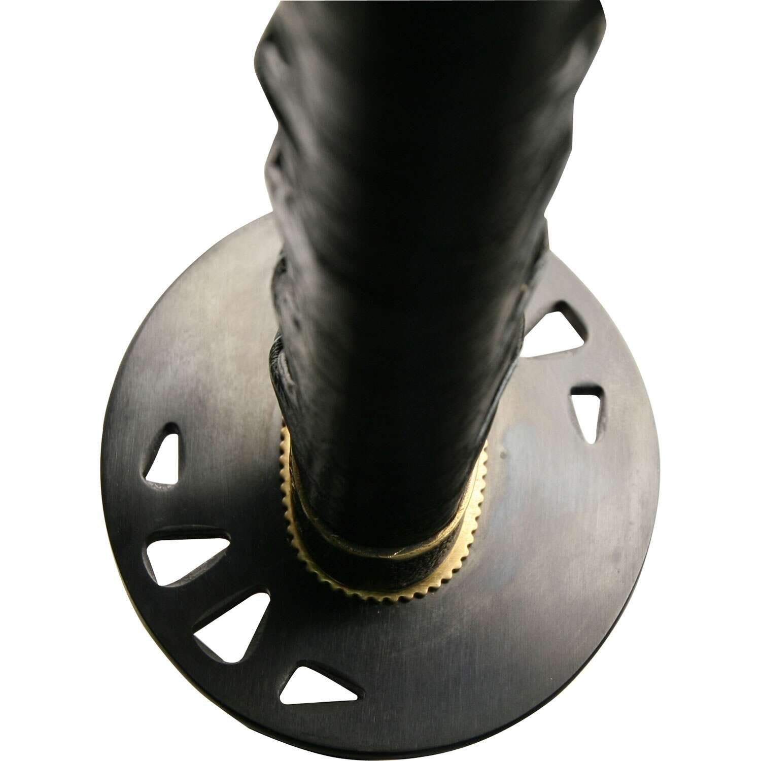Svärdets handtag är lindat med svart bomullsbindning runt äkta 'ray' skinn, vilket ger ett bekvämt och säkert grepp. Den svartlackade svärdsskidan kompletteras med ett brunt band, vilket ger en elegant kontrast. Tsuba är tillverkad i zinklegering för hållbarhet och stil.
