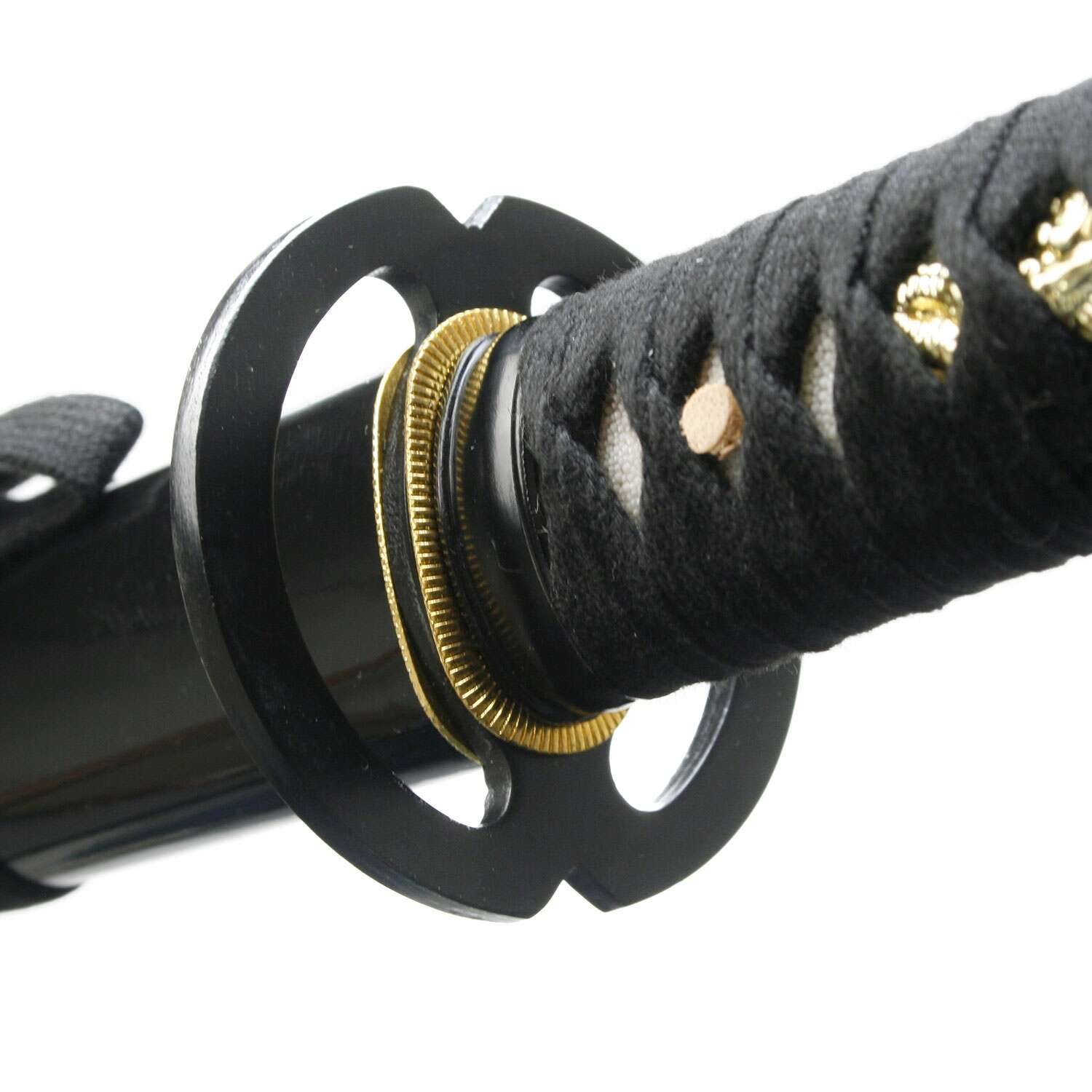 Handtaget (tsuka) är omsorgsfullt lindat med svart bindning, vilket ger ett säkert och bekvämt grepp. Detta traditionella grepp säkerställer att du har full kontroll över svärdet under användning. Järn Musashi tsuban, eller parerskyddet, ger inte bara ett distinkt utseende utan också skydd för handen. För mer hjälp, besök vår hemsida.